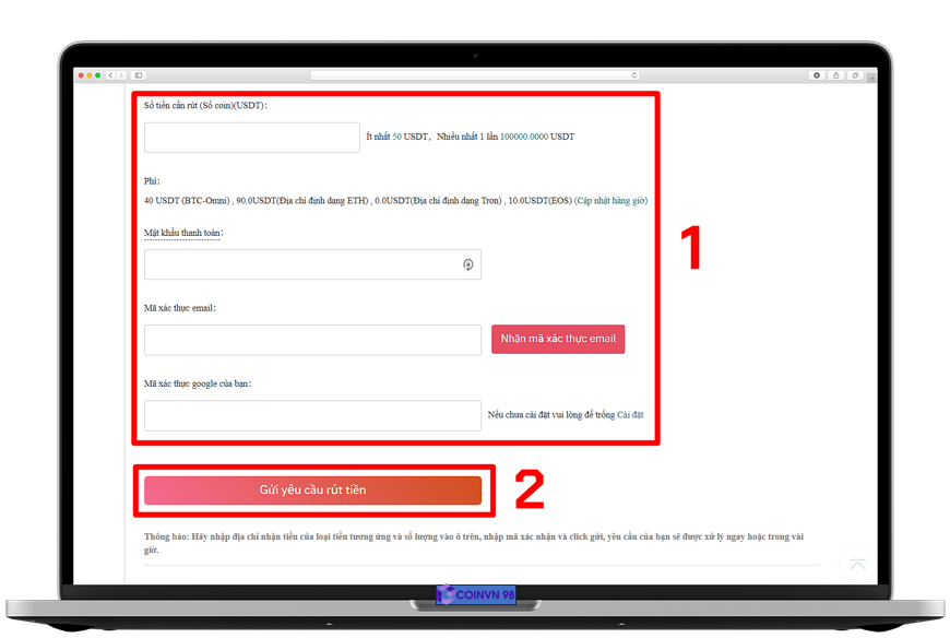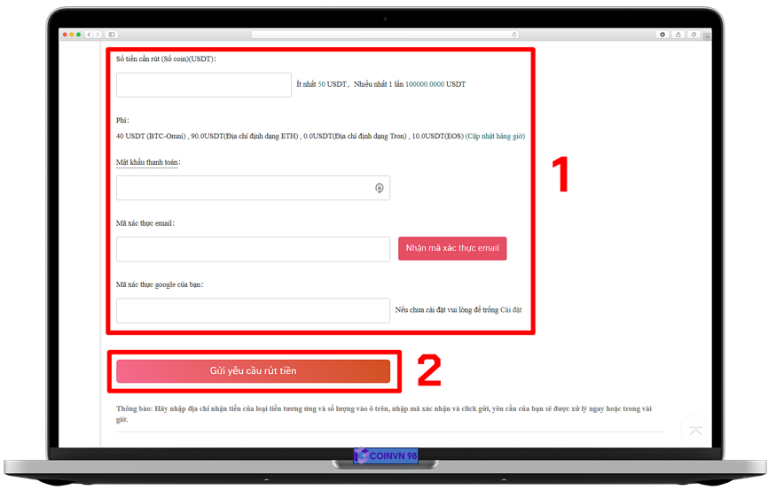 Step 3: Enter the number of coins you want to withdraw => Fill in payment password => Receive email verification code => Enter code => Fill in google authentication code => Click send to withdraw request and you’re done.