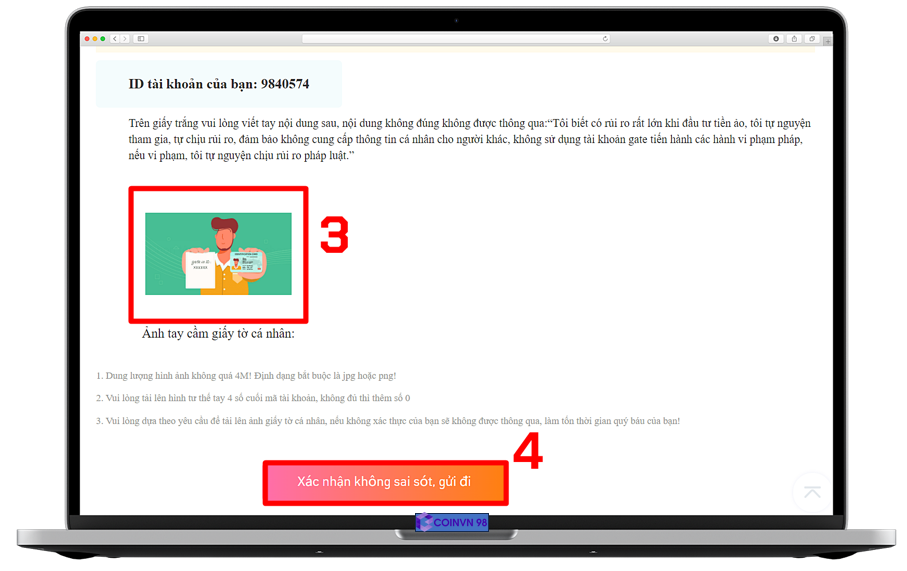 Upload a photo of yourself, holding documents in one hand, and a piece of paper in the other that says “Gate.io + account ID”