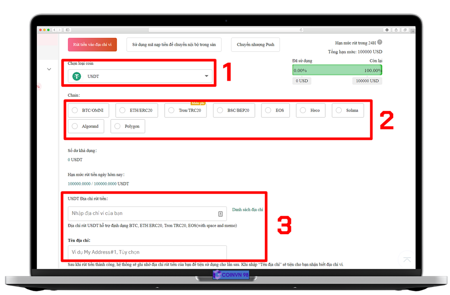 Step 2: Select the type of coin you want to withdraw => Select coin standard => Enter wallet address and address name.